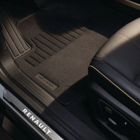 - Alfombrillas con acabado en bordados dorados, que complementan el diseño elegante de la versión Iconic del Renault Megane E-Tech 100% Eléctrico.