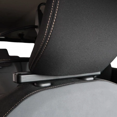 - Se fija al reposacabezas del conductor o del pasajero delantero.